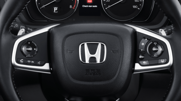 Vô lăng ba chấu, bọc da tích hợp các phím chức năng như đàm thoại rảnh tay, media,… Quan trọng nhất là loạt nút bấm ga tự động thích ứng, hỗ trợ giữ làn đường nằm trong gói an toàn Honda Sensing.
