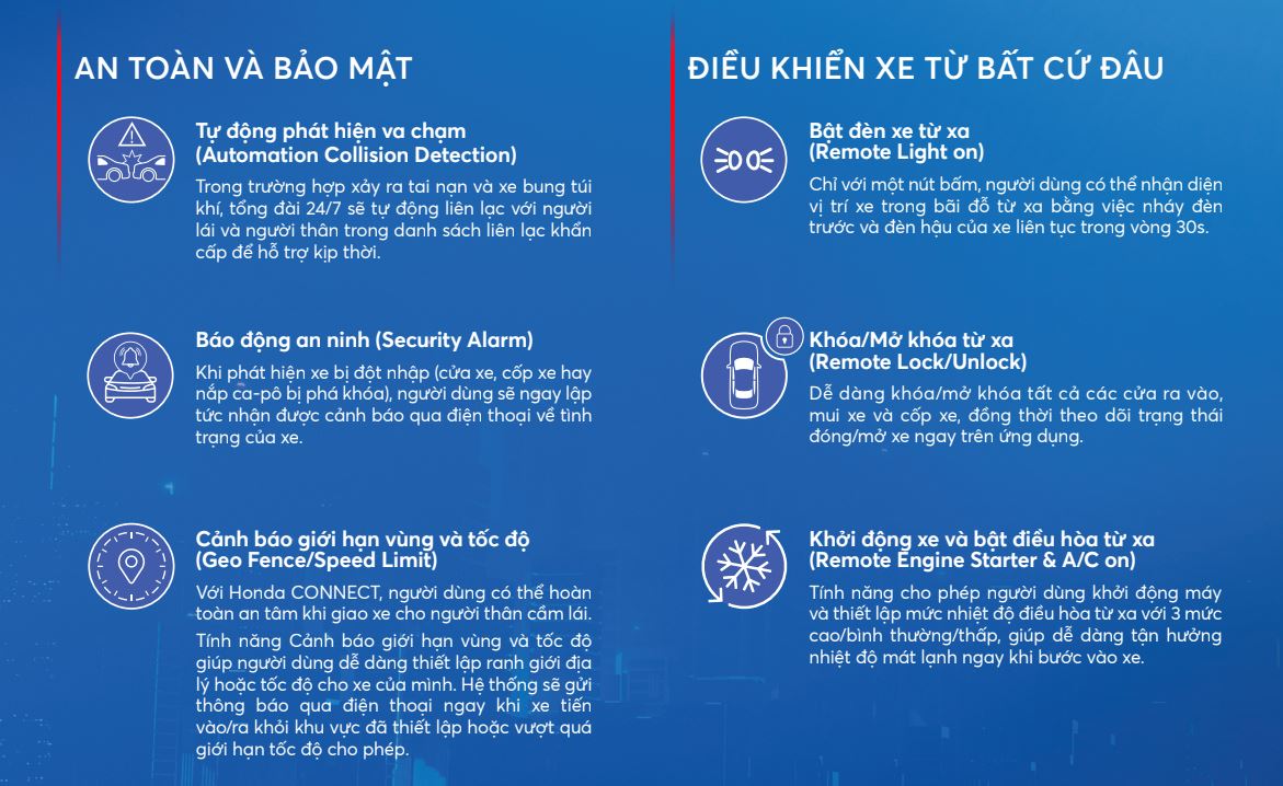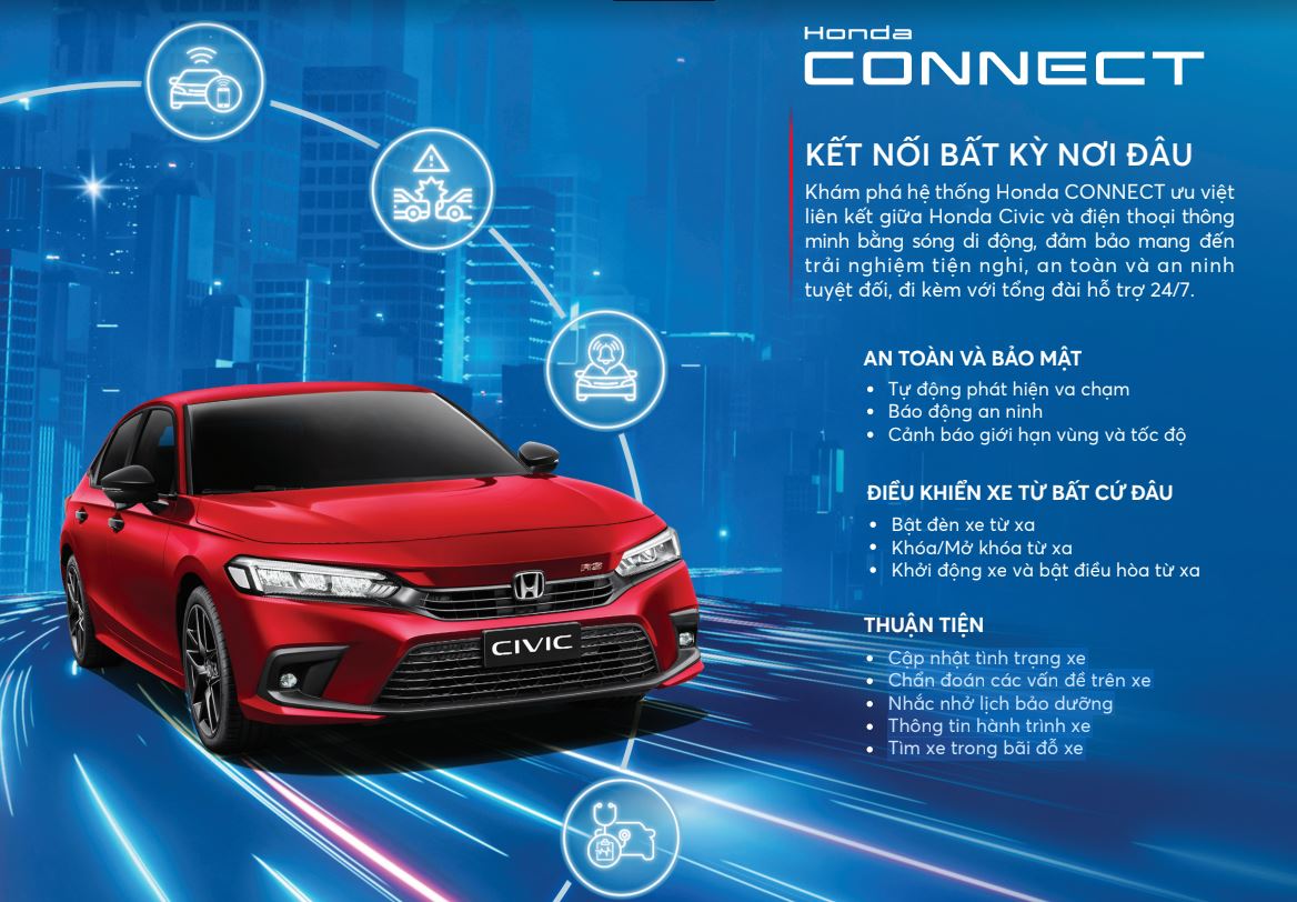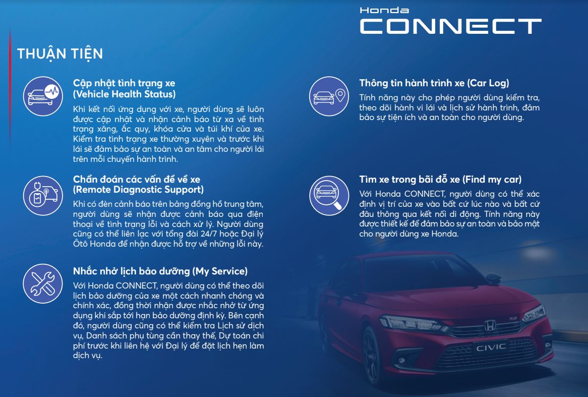Khám phá hệ thống Honda CONNECT ưu việt liên kết giữa Honda Civic và điện thoại thông minh bằng sóng di động, đảm bảo mang đến trải nghiệm tiện nghi, an toàn và an ninh tuyệt đối, đi kèm với tổng đài hỗ trợ 24/7.