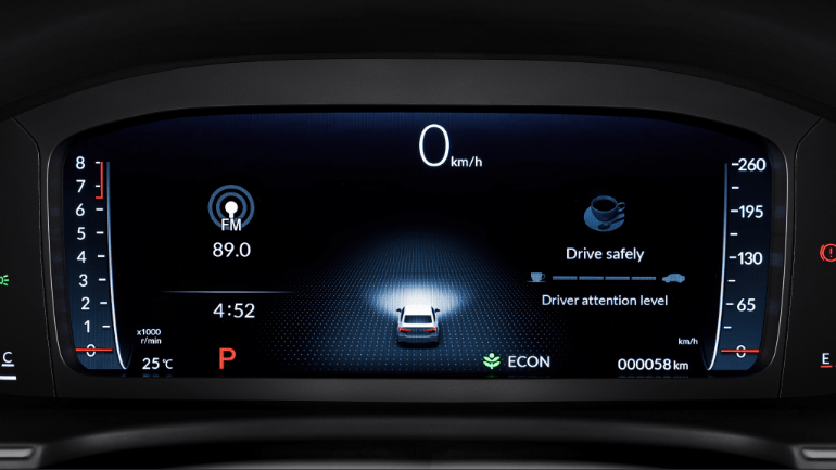 Đằng sau vô-lăng, là bảng đồng hồ kỹ thuật số Digital, sắc nét và hiện đại, hiển thị đa thông số vận hành cho người lái, tích hợp thêm cả chức năng lái tiết kiệm nhiên liệu ECO Coaching.